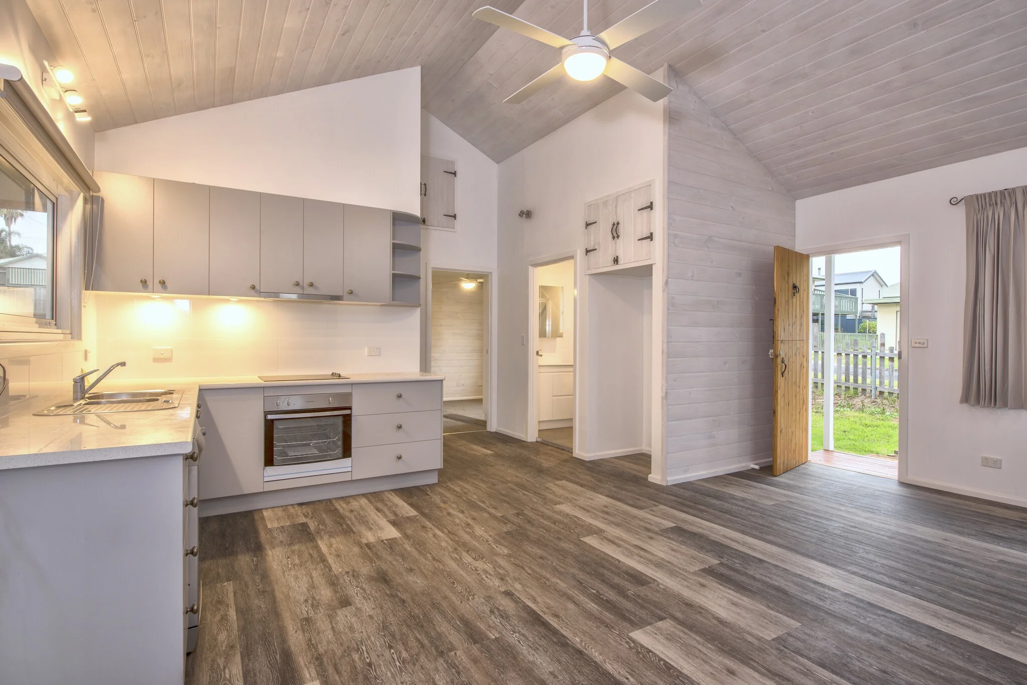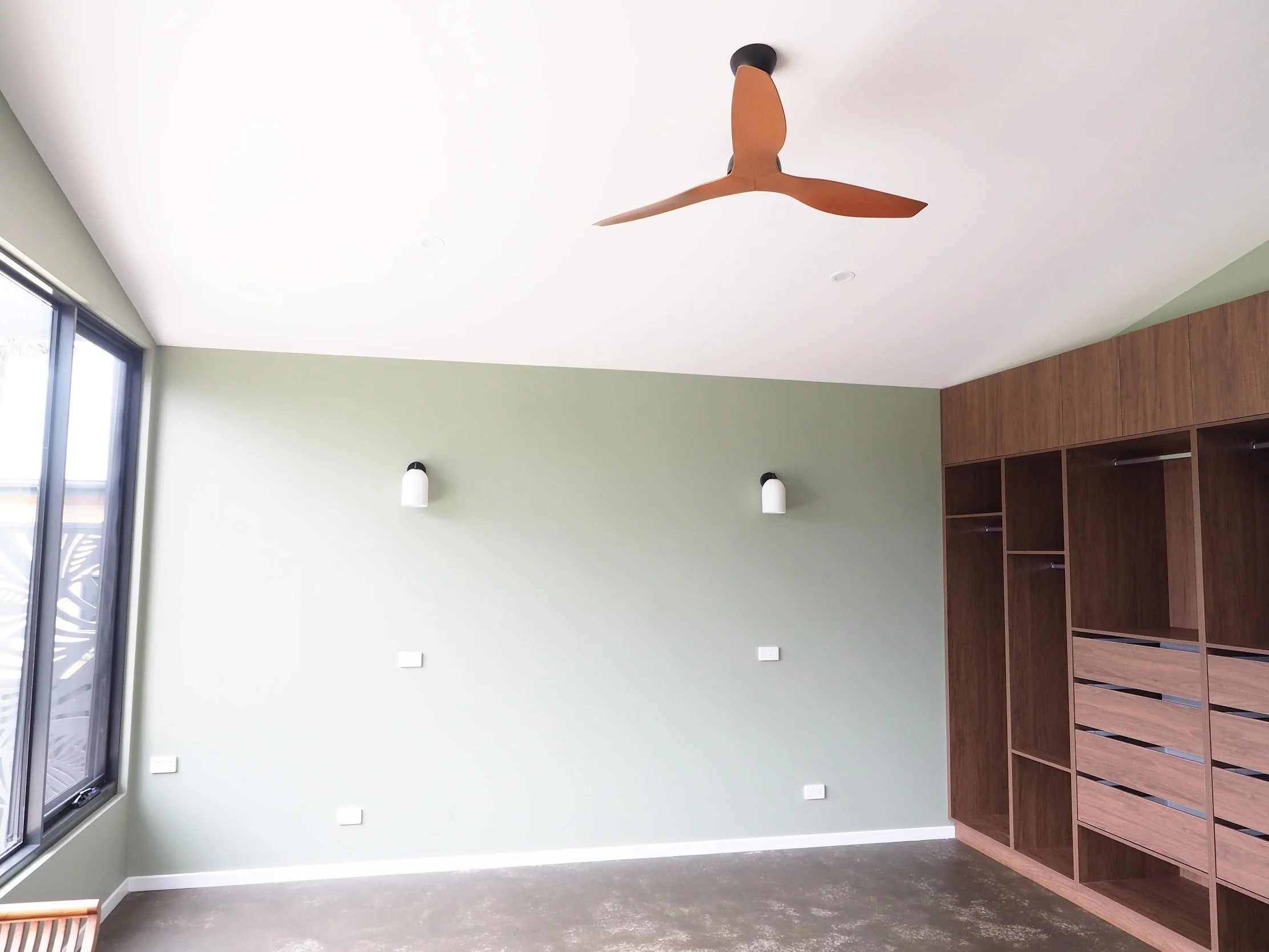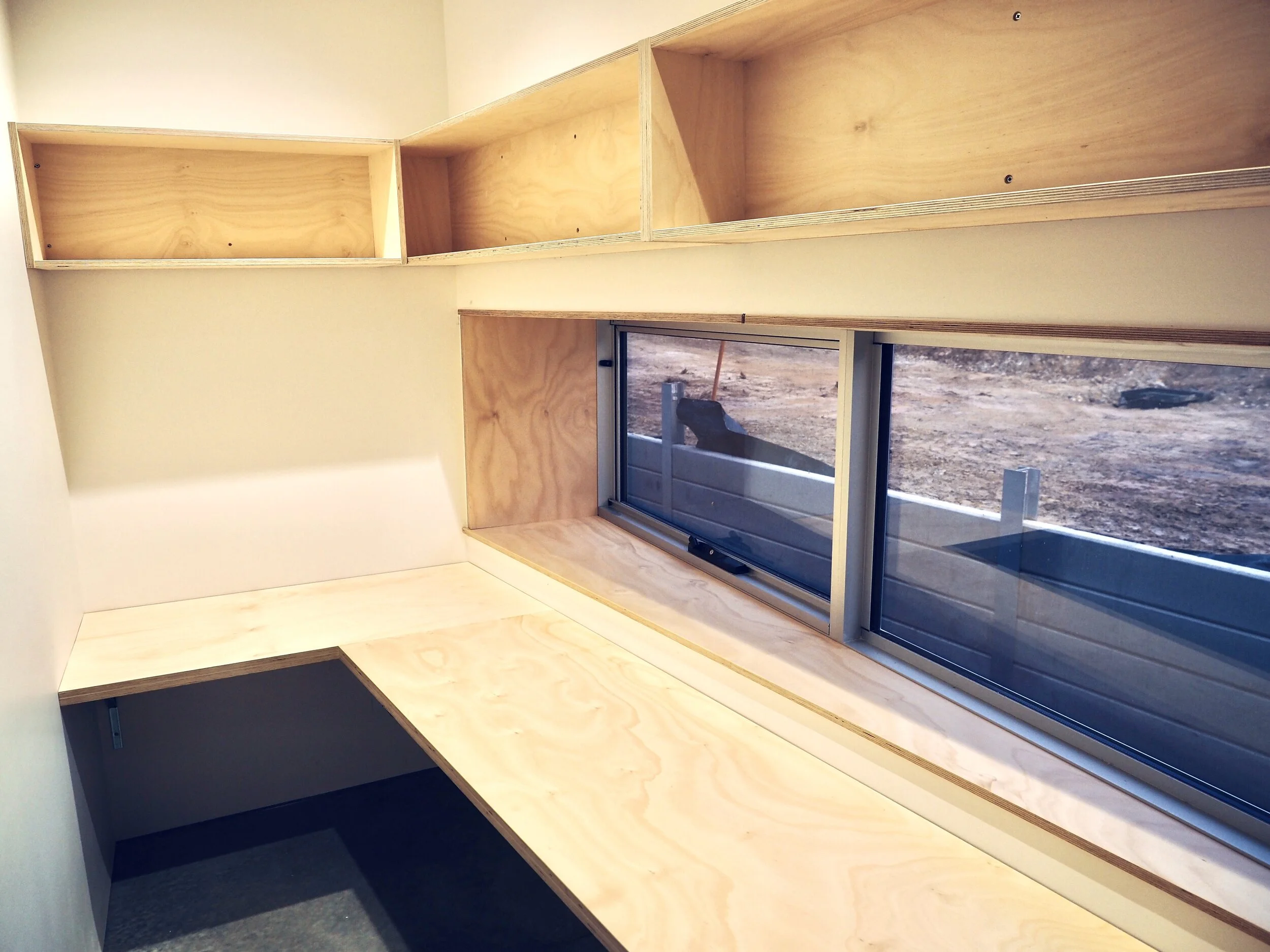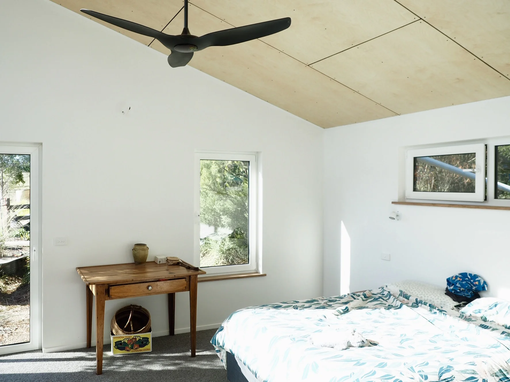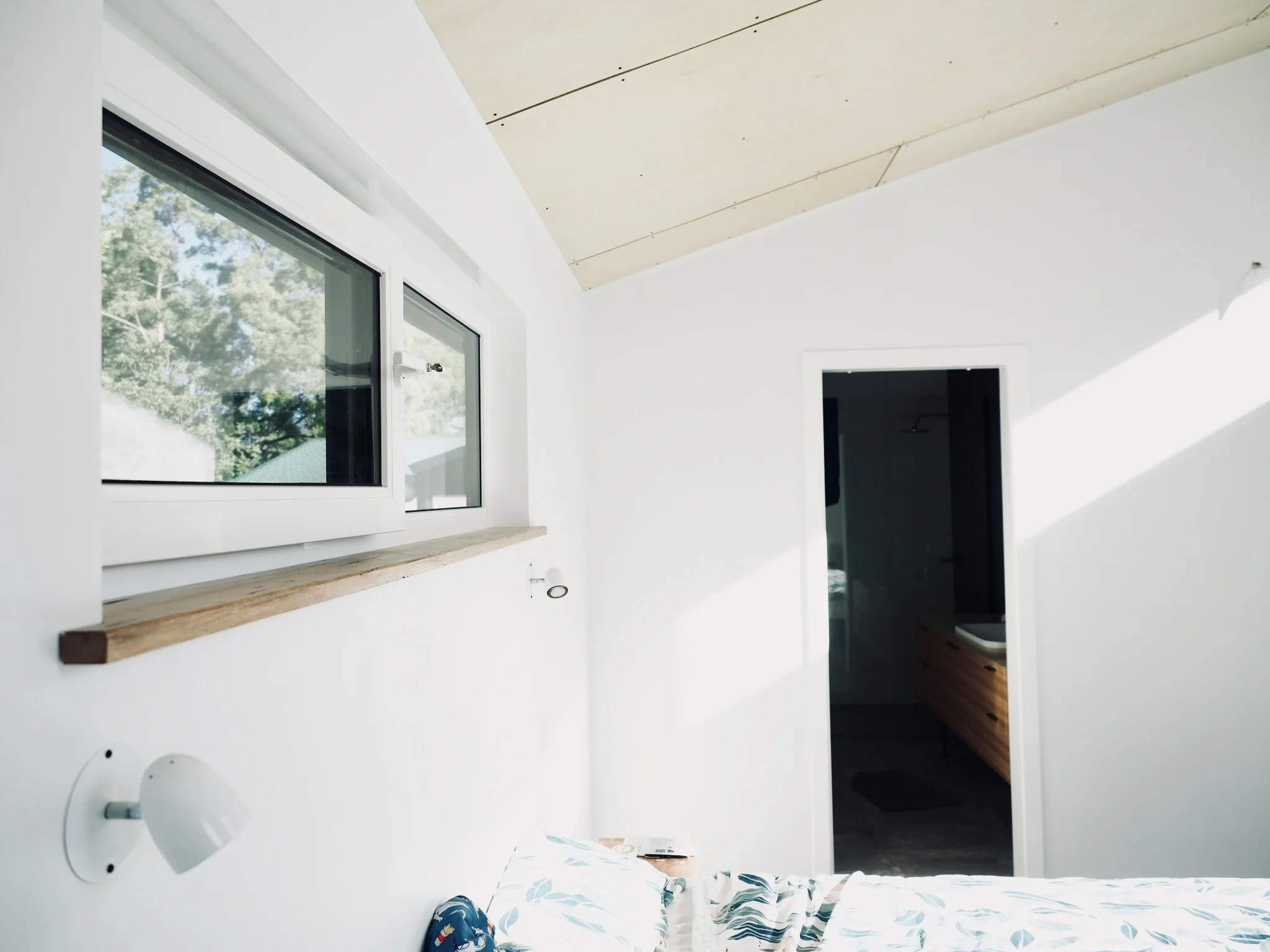 High level of insulation, double glazed windows, north facing highlight window to capture winter sun, cathedral ceiling in living room/kitchen, biomass wood pellet heater, elevated recycled container pool, locally sourced hardwood floors, louvre windows throughout to create natural passive airflow.
