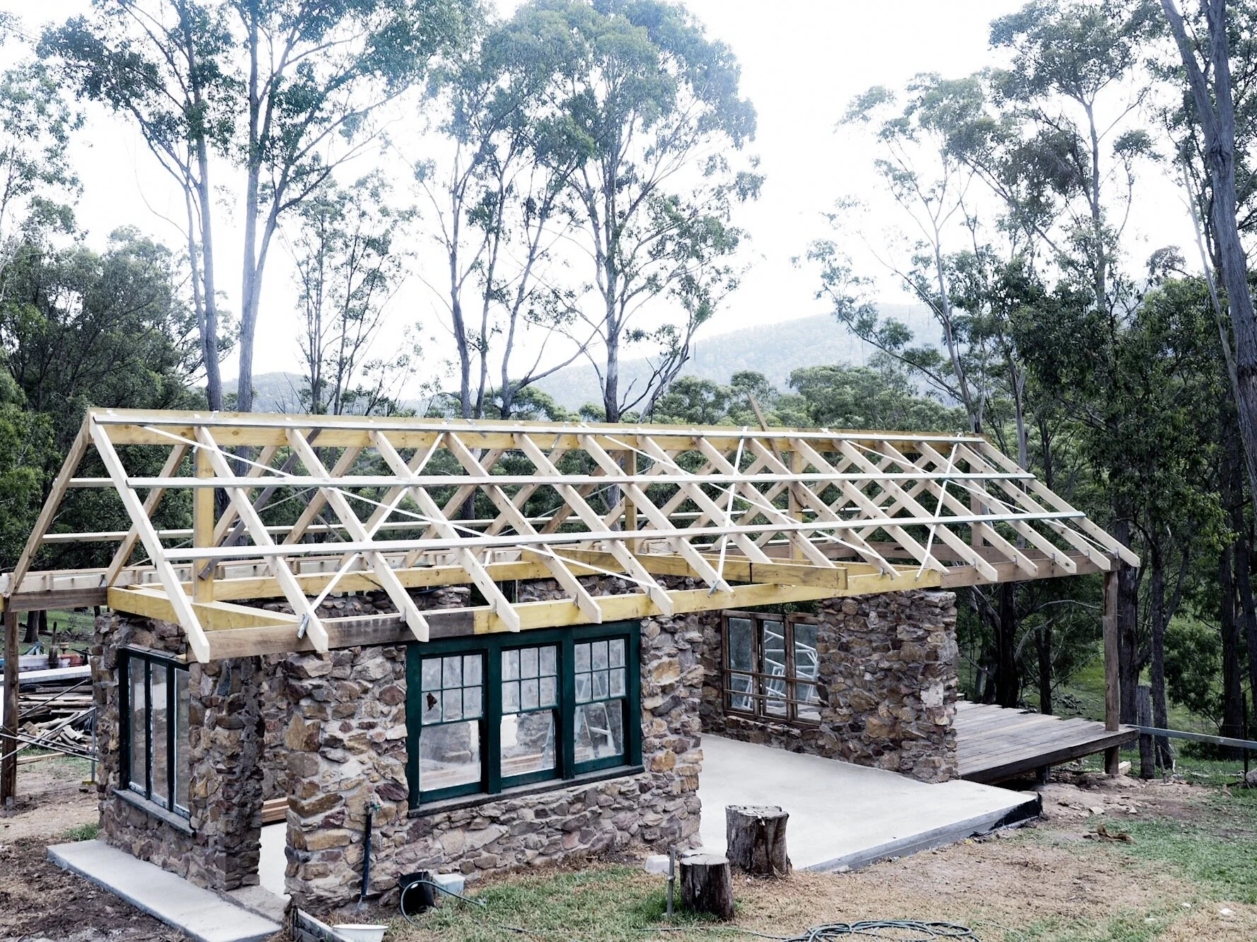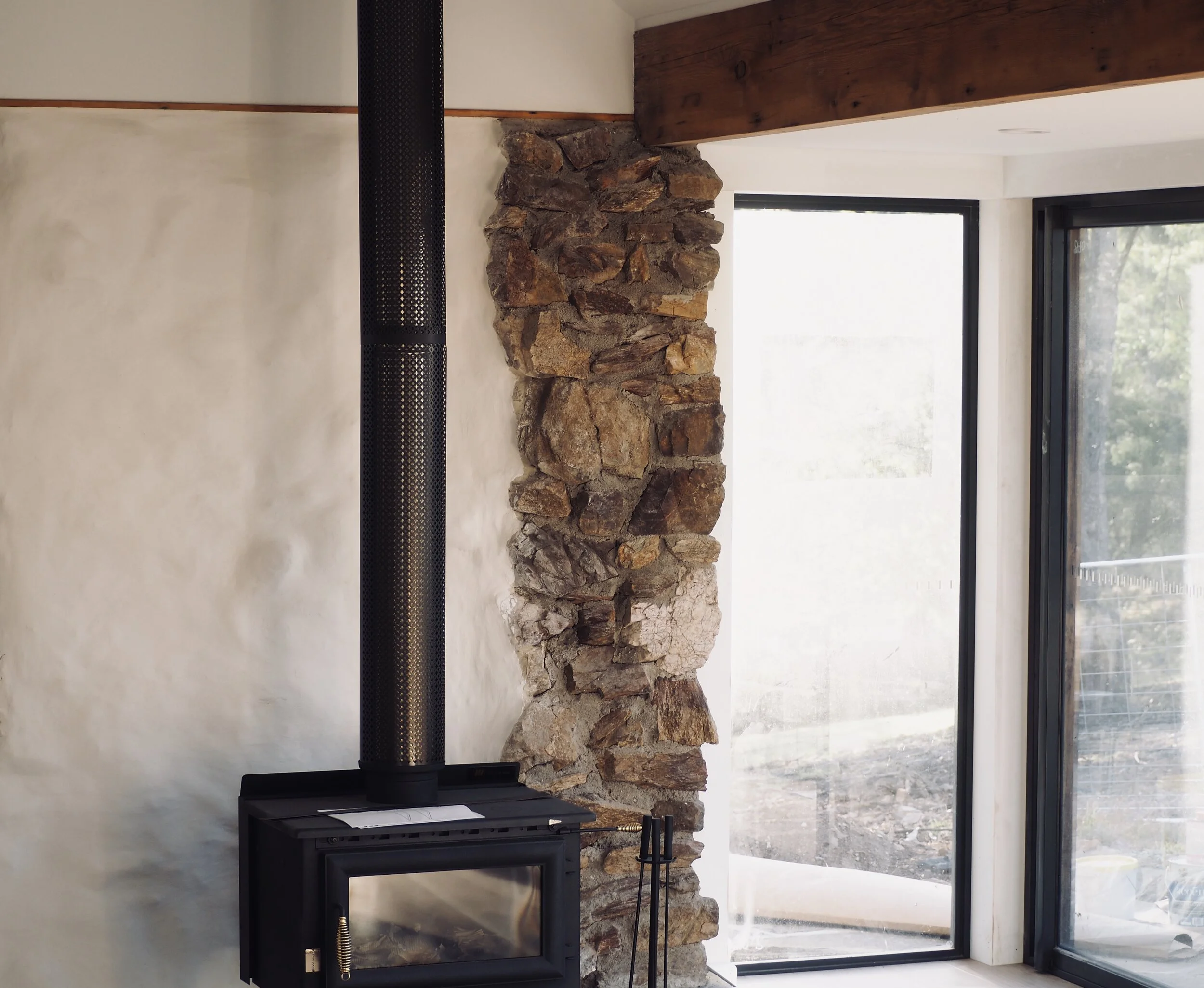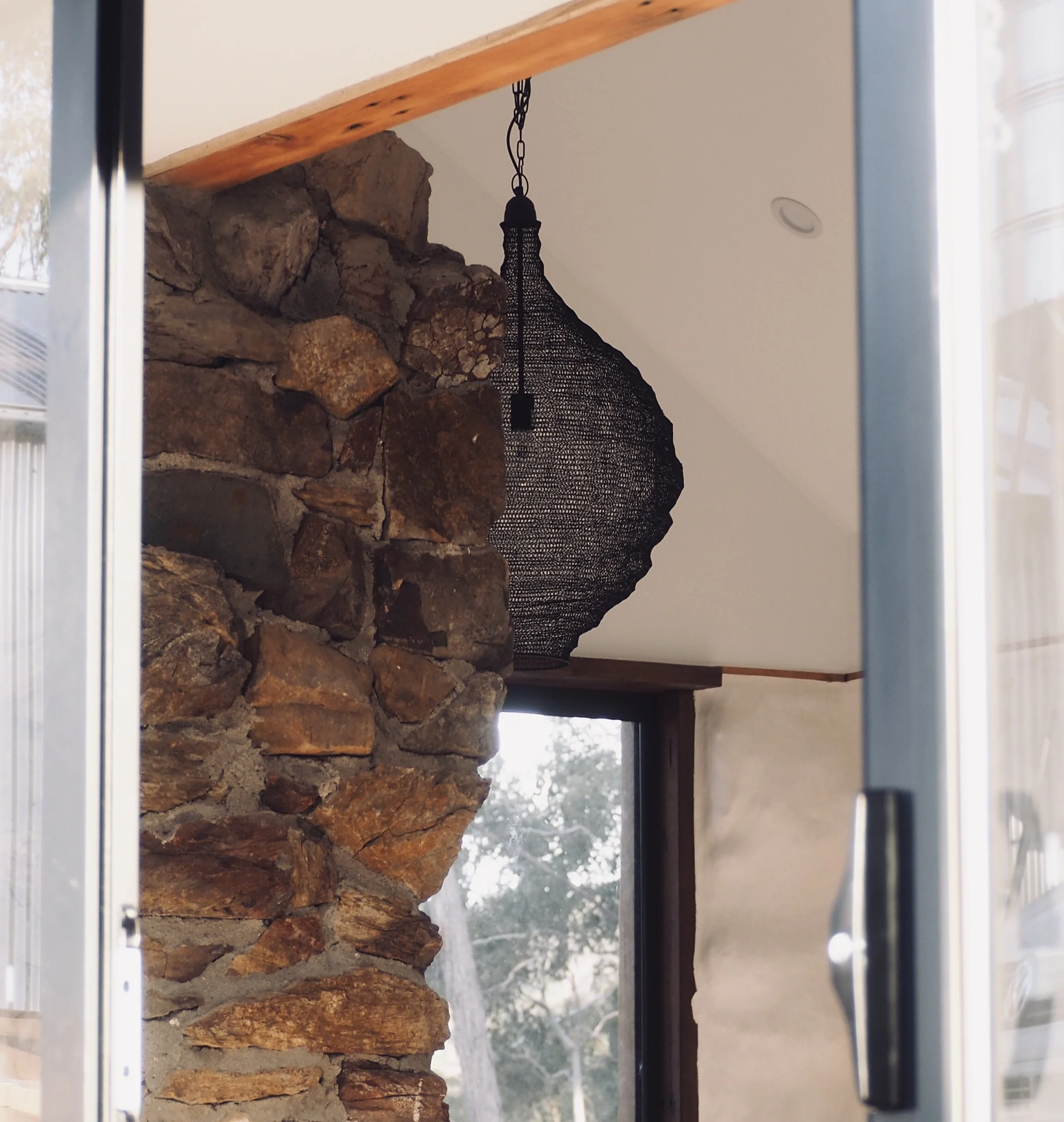 The cottage was stripped back to its old stone bones and rebuild, utilising onsite bush poles and reclaimed timber throughout. A natural lime and sugarcane mulch render was used internally achieving a beautiful soft organic finish while adding insulation and thermal mass to the old stone walls.