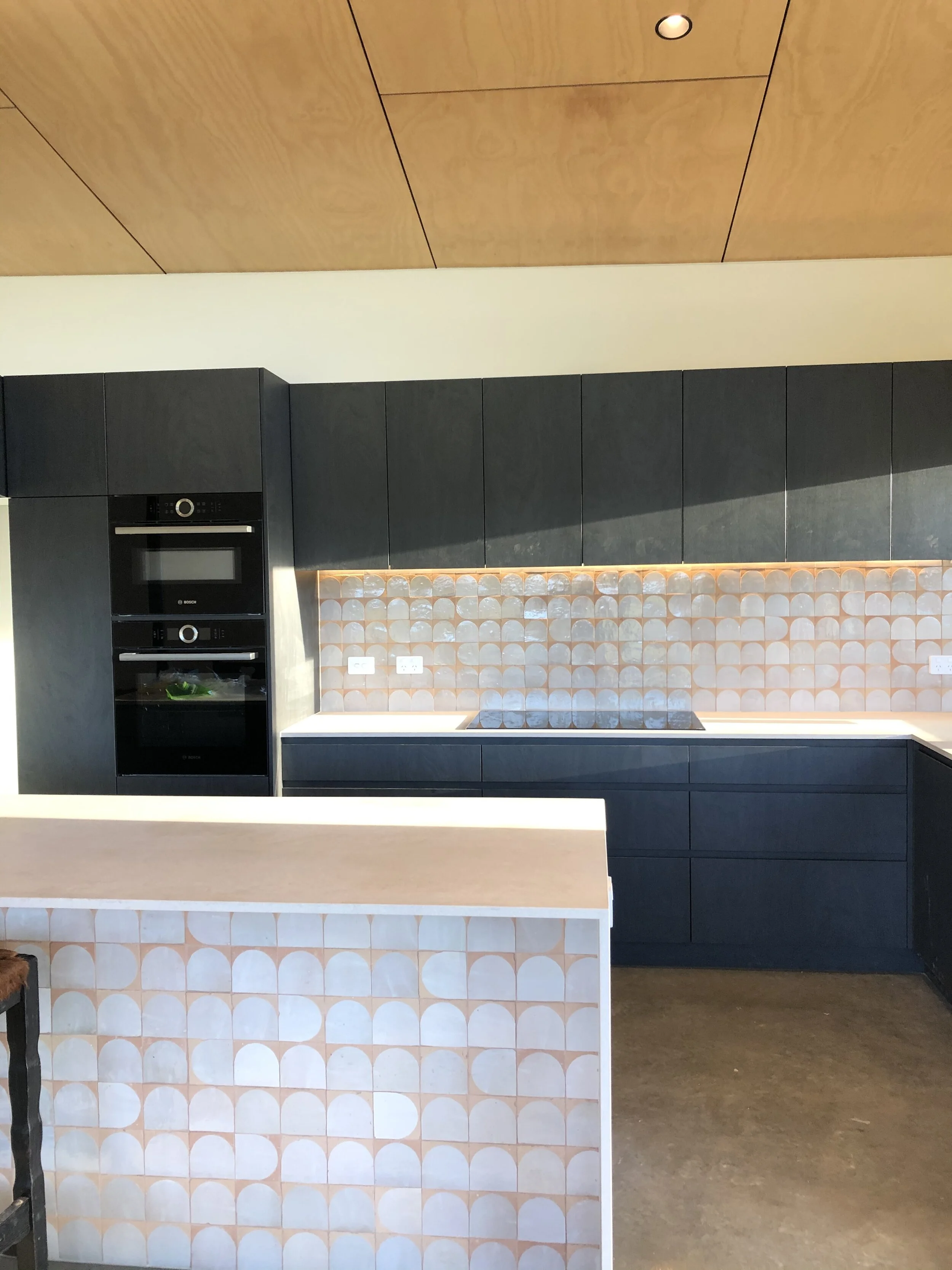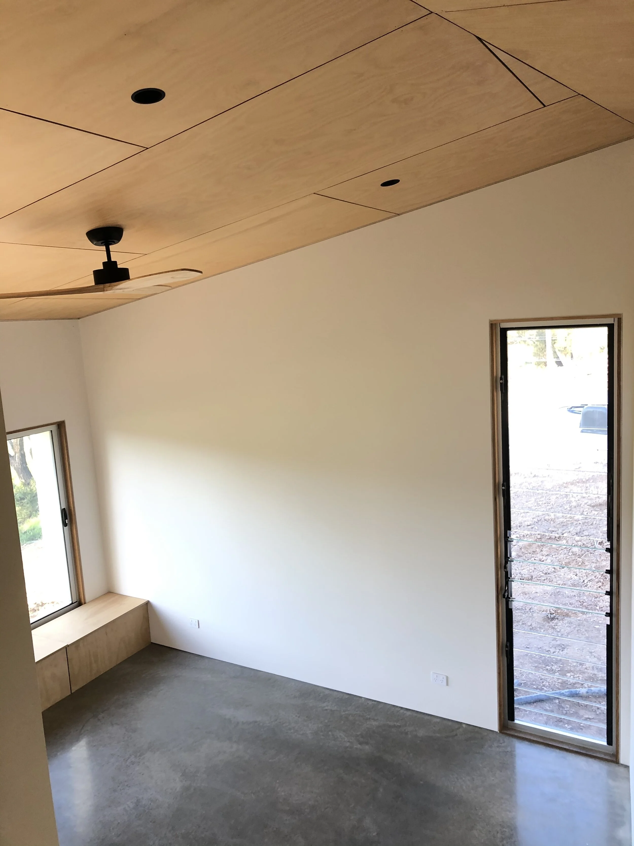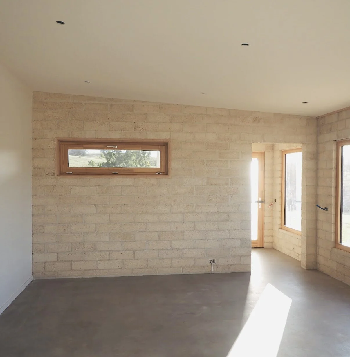 The cottage was stripped back to its old stone bones and rebuild, utilising onsite bush poles and reclaimed timber throughout. A natural lime and sugarcane mulch render was used internally achieving a beautiful soft organic finish while adding insulation and thermal mass to the old stone walls.